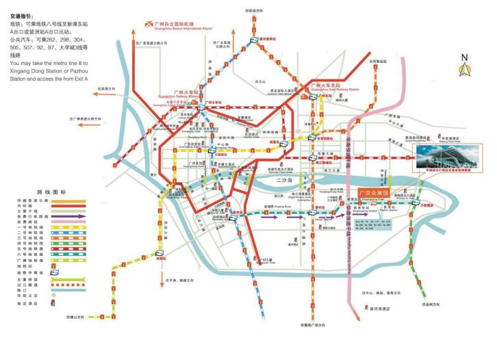 2、 搭乘地铁:从地铁广州火车东站总站乘地铁三号线(火车东站-体育西,坐 2 站)到体育西,转乘地铁三号线(天河客运站-番禺广场,坐 4 站)到客村转乘地铁八号线(万胜围方向,坐 3 站)至新港东 A 出口出站后可抵达展馆。